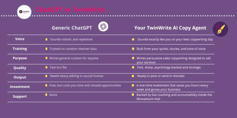 Oooo GOOD question. And valid. Know that ChatGPT is out of the box generic. It doesn’t know your voice, your quirks, or how to persuade like a pro. TwinWrite is built from your stories and my 25+ years of sales psychology, so every piece of writing sounds like you. Dare I say, even better than you. Your copy will be sharper and more ethically persuasive. It’s not just content, it’s copywriting that sells. ChatGPT creates content. TwinWrite creates copy that creates more clicks, clients and cash for YOU.